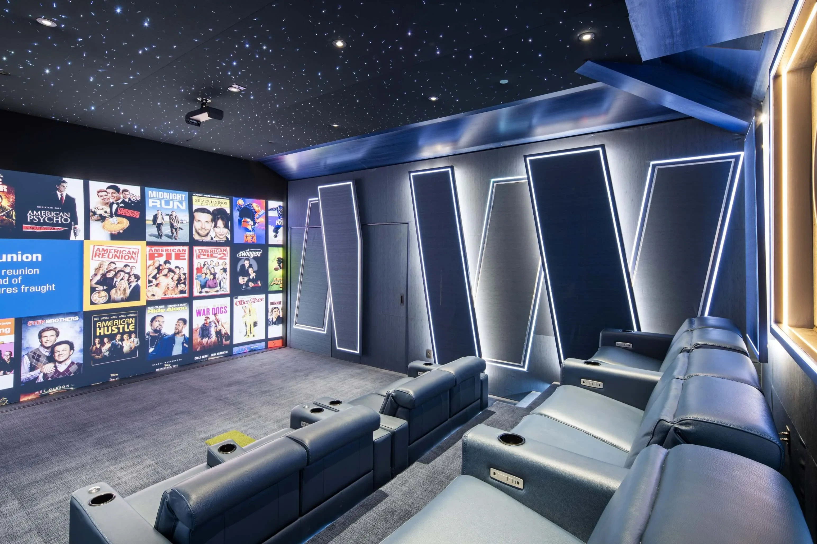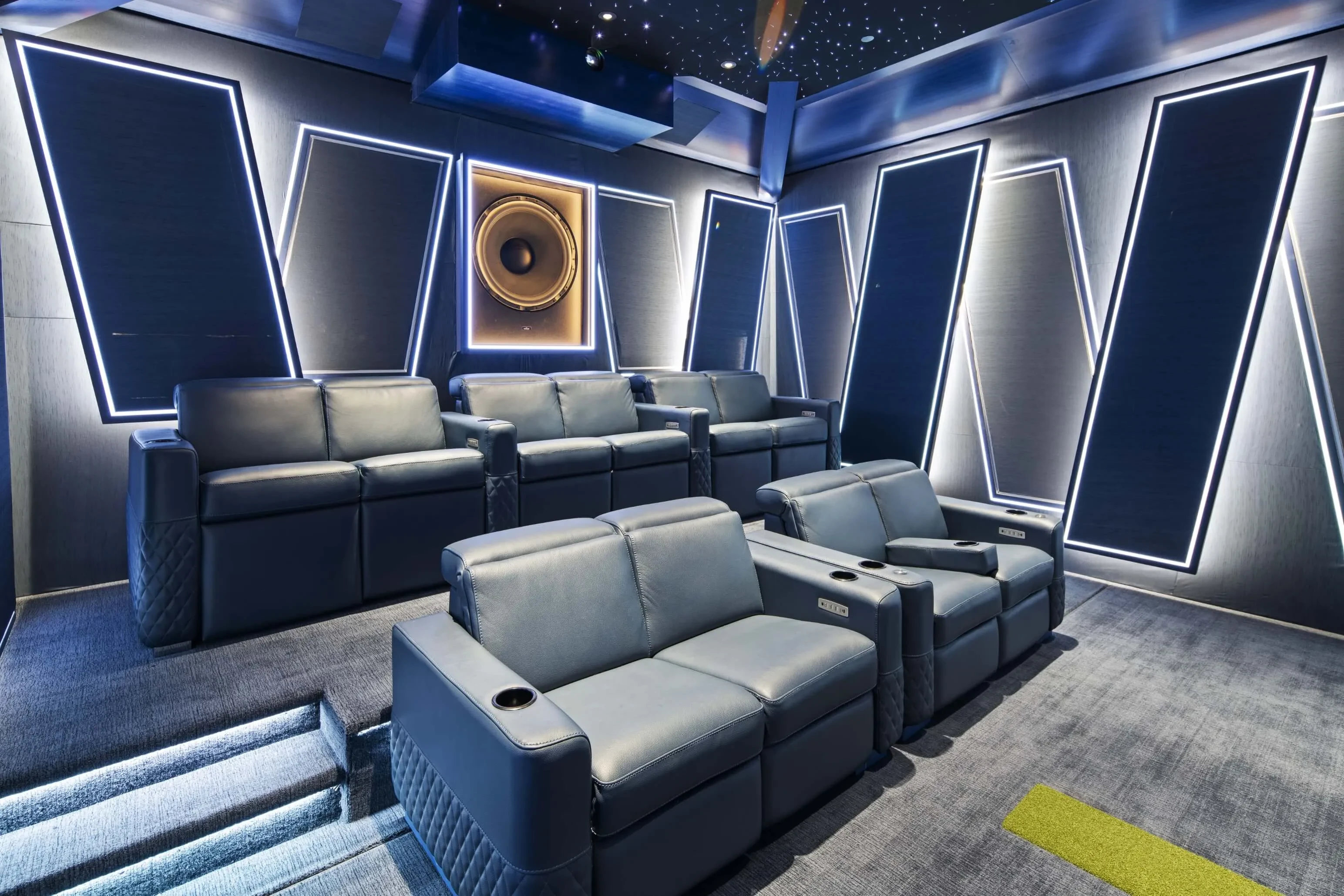 Home theater interior designer Lisa Slayman ensured that the room avoided the traditional “black box” aesthetic. Custom blue-stained veneer wraps architectural elements, geometric motifs add visual rhythm, and projection equipment is concealed within a purpose-built hush enclosure.