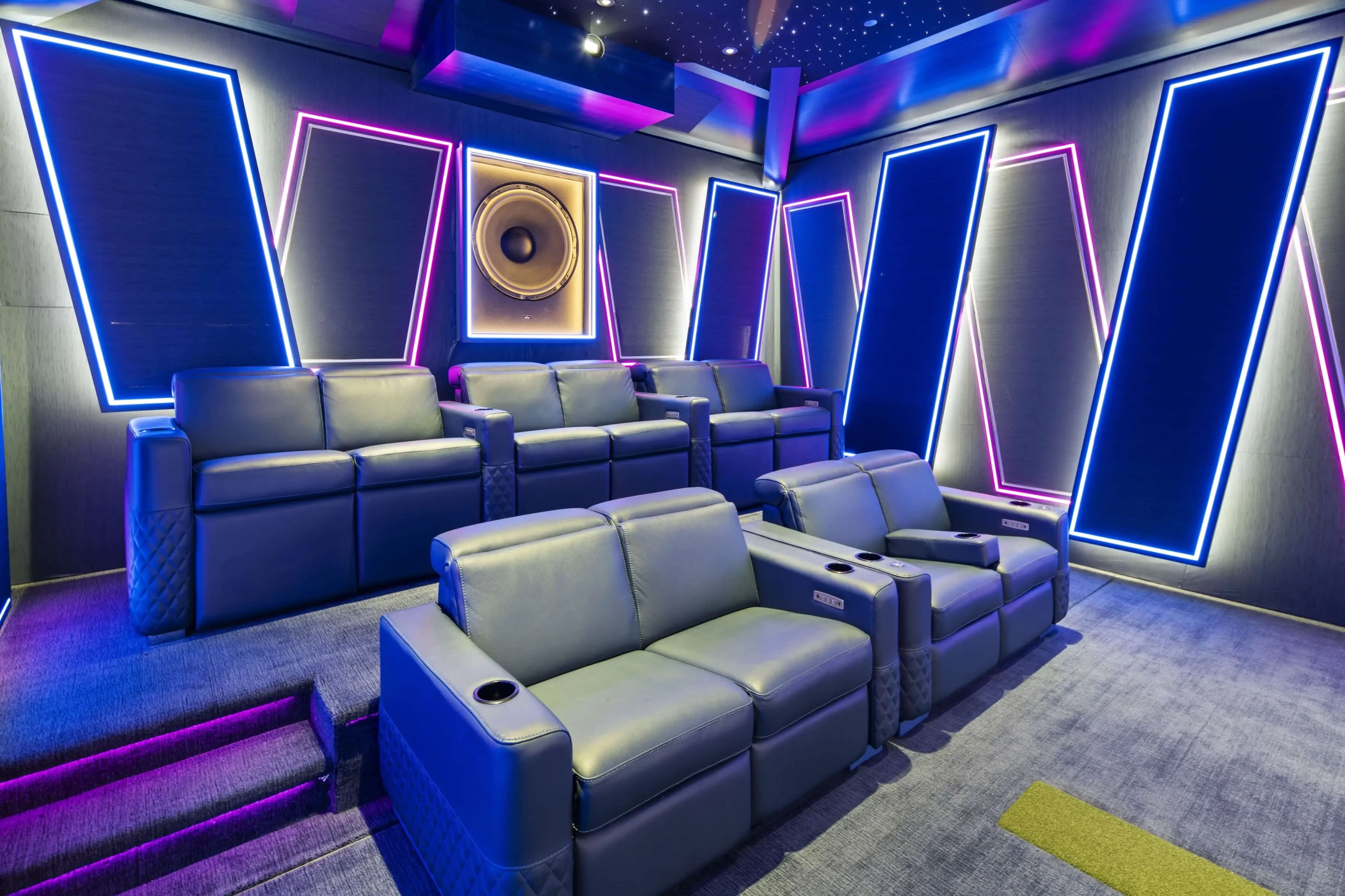 Originally planned to be hidden, the ASCENDO 32-inch subwoofer remains visible at the client’s request, a sculptural statement that reflects the system’s performance intent. Lisa framed the subwoofer with eye-catching LED lighting to draw attention to its size and sublime presence in the room.