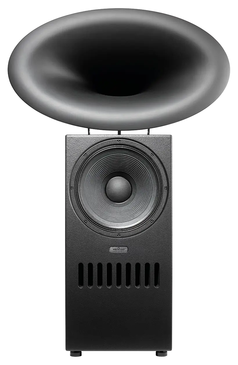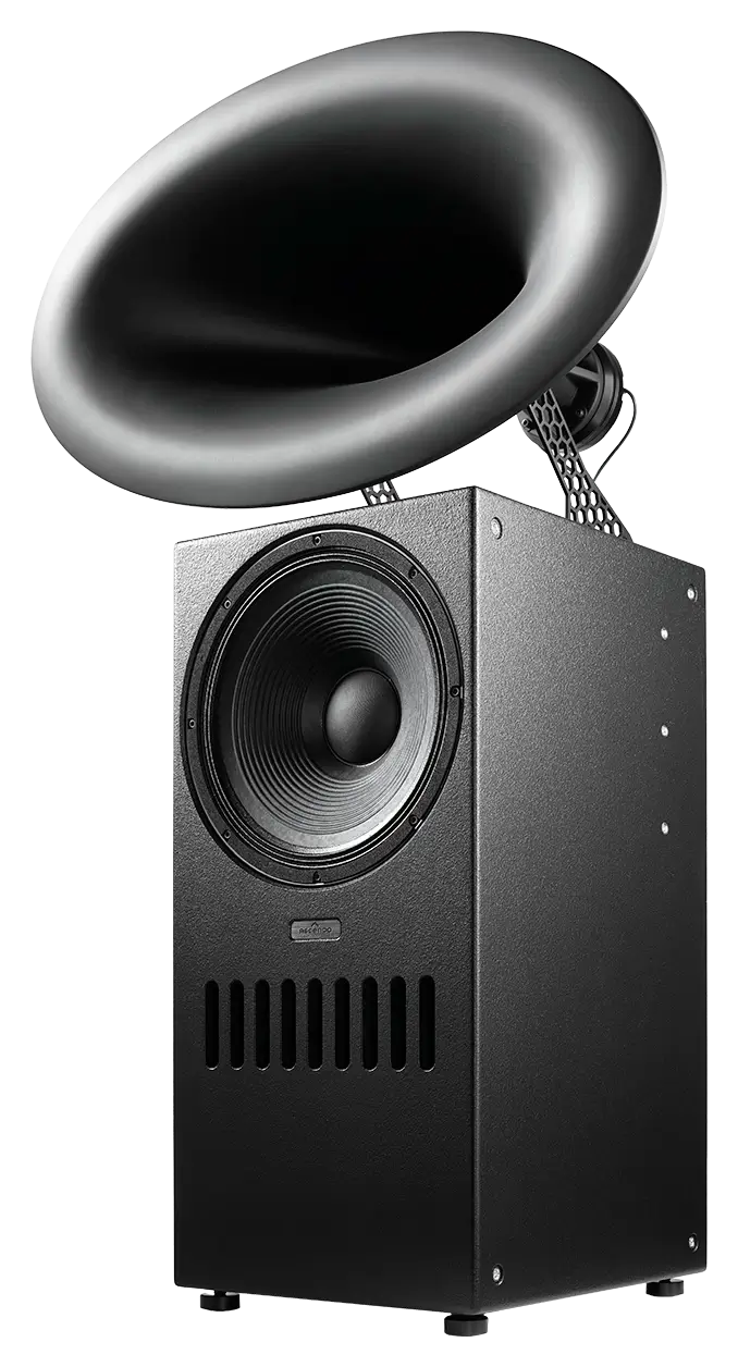 Equipped with a point source asymmetrical horn system, exclusively designed and custom-made to reach a low crossover point and perfect mid to high frequency reproduction. This time-coherent linear phase, high-performance point-source, combines with an ultra-fast and highest sensitivity 15-inch mid-woofer to an extremely impressive and extraordinary performing musical speaker system, that leaves nothing to be desired. Reference levels even at huge commercial theaters are one trait of this unmatched speaker system.